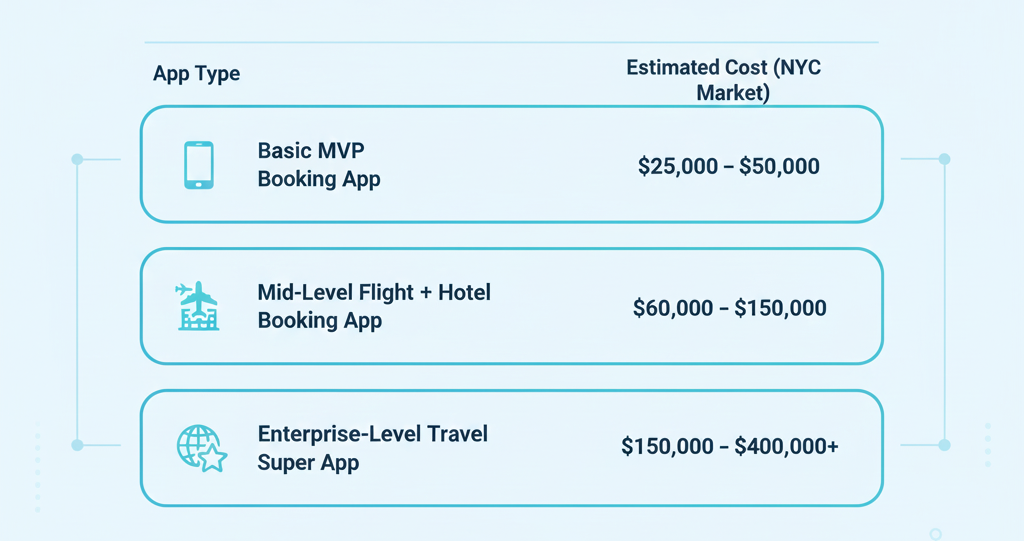 To help you plan your investment, here’s a clear and updated 2025 pricing guide based on real New York market rates and leading travel-tech development standards.