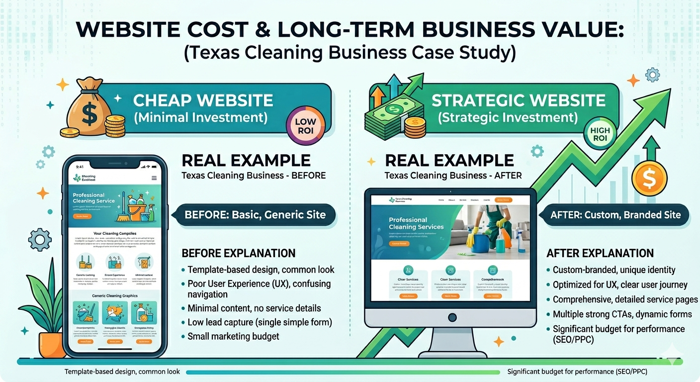 A cleaning service business in Texas initially invested around $2,000 in a website, which looked visually acceptable and functioned properly, but failed to generate enquiries despite receiving some traffic.