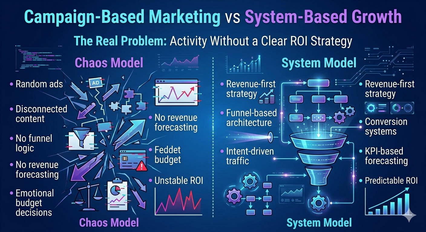 This article will unpack why most digital marketing campaigns fail to deliver ROI, what must fundamentally change, what strategic direction the fix requires, and what a correct marketing + revenue system actually looks like when built for long-term, predictable growth instead of short-term performance spikes.